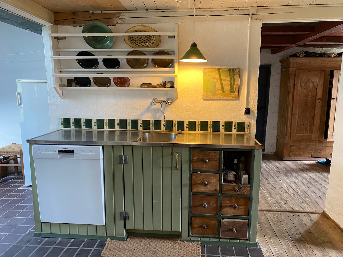 “Hist where the road strikes a bay, there is a house so beautiful. The walls are a little crooked, the windows are quite small, the door sinks half to knees, the dog does what little care, under the roof swallows chirping, the sun sinks-and then wide.” Wrote the famous Danish poet. This is also the case in Flade Klit 5. Here is this old soulful house, in a landscape so beautiful that you are surprised. Under the great sky, in a silence that is rare to find in this world. Here time stands still. Welcome