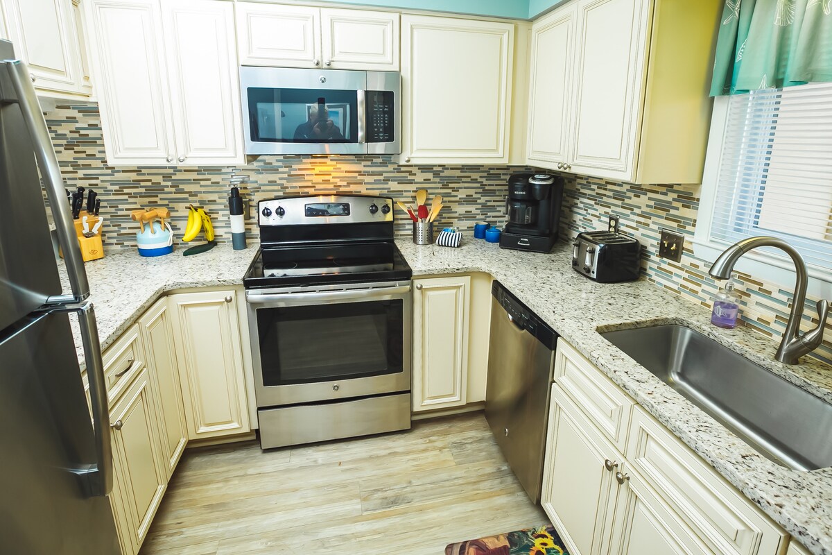 This spectacular ocean view condo with top notch renovations is just steps from the beach. Be swept away by the view of the rolling waves, whitecaps, and the OKI Pier as you relax and enjoy a beverage on the balcony. You will also be treated to a breathtaking sunset as the colors change each minute across the sky. Retire to the living room and rest your tired feet on a comfy sectional sofa as you interact with others in an aesthetically pleasing open floorplan setting.