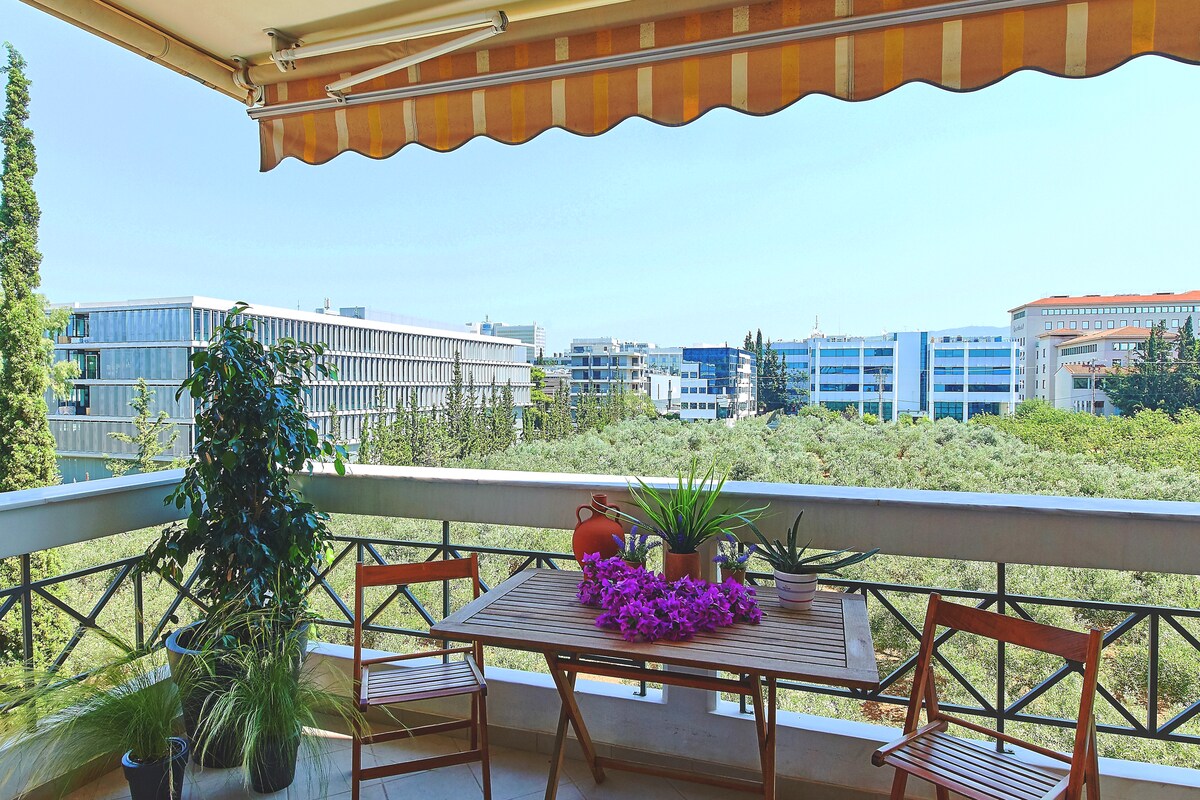 Enjoy a new (2021) quiet and centrally located apartment in the business district of Marousi with a green view and free parking close to hospitals (Ygeia, Mhtera, Athens medical center and Iaso) OAKA Olympic Stadium of Athens , walking distance to Golden Hall shopping mall ,restaurants, supermarket and metro Kifisias.