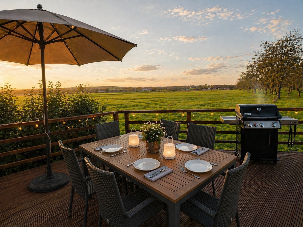 Panoramic Views with Spectacular Sunrises Enjoy breathtaking sunrises every morning. Our accommodation is modern and fully furnished with brand-new furniture. The trade fair grounds and city center are only a 5–10 minute drive away. Perfect for families with children, couples, solo adventurers, business travelers, and groups of up to 5 guests. Quiet suburban location with easy access to nature.