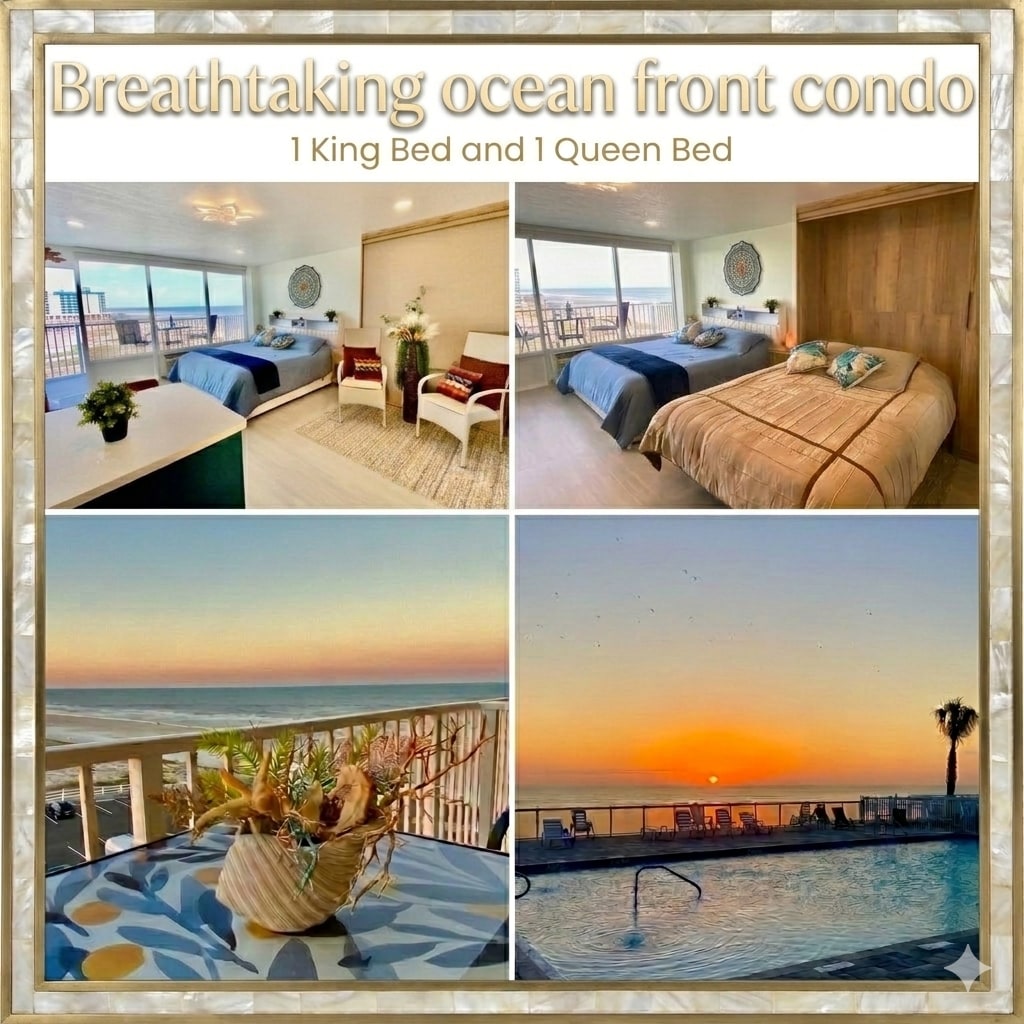 Enjoy our Heated indoor pool We are located on Daytona Beach a 1 minute walk through the pool area to be on the beach. With open pool Netflix Included, Experience our newly renovated King room studio, large balcony with amazing beachfront views it feels like you are on a cruise ship over the ocean. We have all kitchen items needed for cooking and we provide Coffee, cream, sugar .We provide all linens and towels and Beach towels and beach chairs.