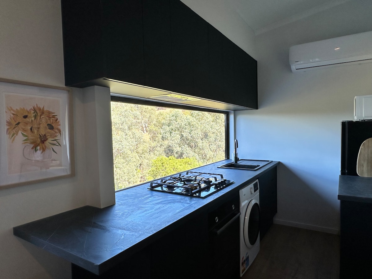 Separate from our home & nestled among treetops, our Alpine-inspired studio promises a blend of warmth & modern comfort. Wake to the melodies of birds as the morning bathes the landscape in soft light. From your balcony, savour panoramas framed by grand gums. Venture to nearby nature trails, local wineries & the renowned wineries of McClaren Vale. With our friendly Labradors & family hosting, expect a blend of hospitality & privacy. Thoughtfully equipped kitchenette. Fast NBN wifi.