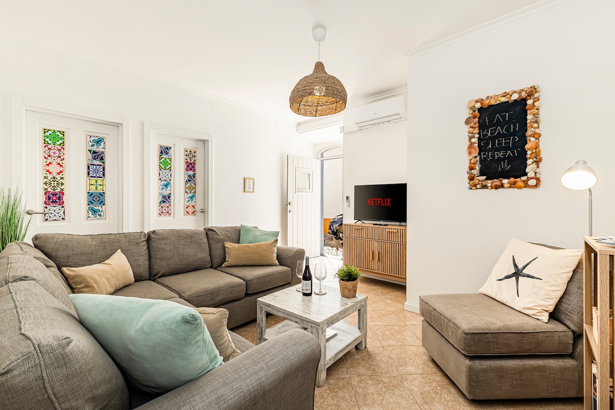 Typical house that makes us relive the past with all modern comforts. The vaulted brick ceilings, richly decorated cement tile floors and interior doors have remained intact. After long walks in the historic and mysterious streets of Olhão, or a day spent in the beautiful islands, we appreciate the well-being and serenity of the sunny and comfortable terrace.