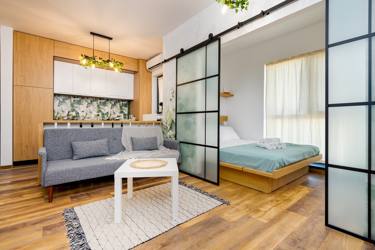 Bright and spacious studio apartment located in a 10 floors building, newly renovated with a fully equipped modern kitchen with an electric hob, integrated fridge and refrigerator, and all other necessary kitchenware for making a gourmet meal. It is placed in a great area with quiet neighbourhood, less than 15 minutes to City Centre, with direct public transportation to the old town, close to a big variety of beautiful parks and lakes such as Tei, Plumbuita, Circului. Free car park available.