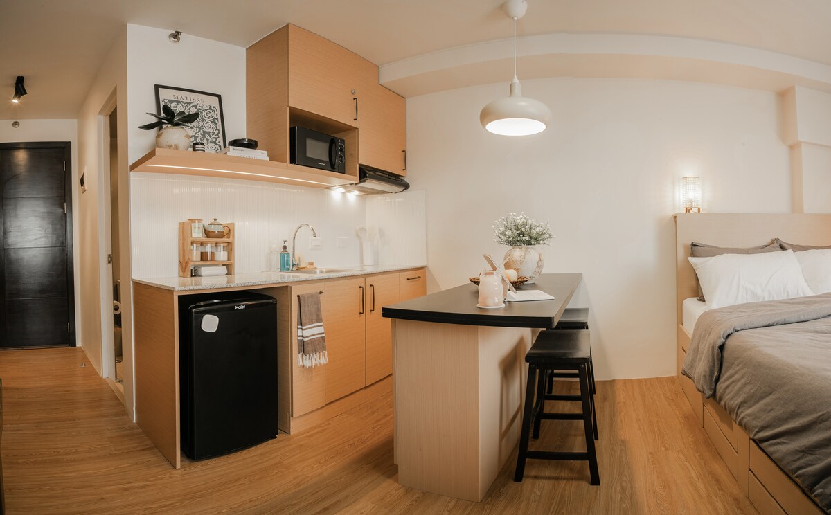 Your home away from home. A cozy, elegant yet budget friendly place you can crash on your vacation! 💛 Features and Amenities: ● Fully furnished ● Complete kitchen equipments and utensils ● High-speed wifi ● Airconditioned ● 55' Flat screen TV and Netflix ready ● Hot & Cold Shower ● Gym ● Pool ● Study Area Location: Right at the Heart of Cebu City! ● 8 min away from Ayala, Cebu Business Park ● 10 min away from IT Park ● 15 min away from down town Colon ● Convenient access to tourists spots