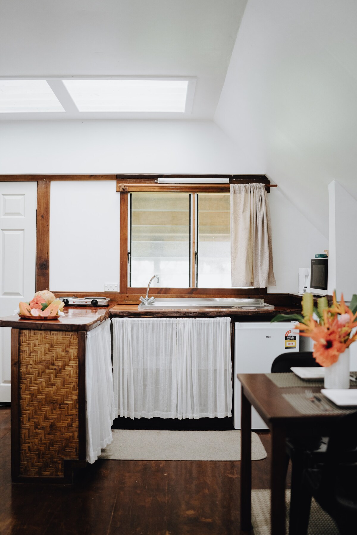 Gorgeous brand new studio bungalow with a view of the beautiful hills and the beach within walking distance. Moemoea Ta'i is the second bungalow just metres away so perfect for travelling with friends or family. Moemoea Rua is fully self contained with insect screens on all windows (except kitchen window) and the insect screen on the sliding door can be locked so you can leave the door open and enjoy the breeze. Best to get a taxi or transfer to Moemoea.