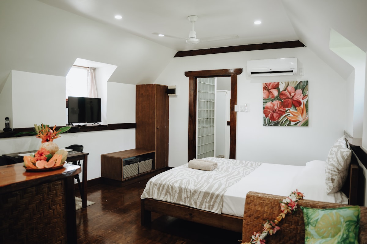 Escape to Tai Marino, a self-contained beachfront bungalow with everything you need for a relaxing island stay, kitchen, bathroom, TV, free fast Wi-Fi, and air-con. Just a short walk from local eateries and hiking trails, and only 5 minutes’ drive from the airport and town. We’ll greet you with free return airport transfers (plus a mini tour), and are happy to help with rental vehicles, tours, or even arrange a private lagoon cruise or a massage right in your bungalow.