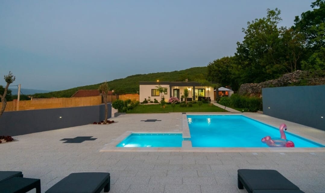 Villa Forest Idyill is located in the quiet hinterland of the famous Makarska Riviera, in the picturesque town of Krivodol, not far from the city of Imotski. This modern newly built villa offers complete peace, privacy and the opportunity for a complete vacation in the heart of nature. The villa is a ground floor that provides its guests with comfort and spaciousness at every step. The villa has four air-conditioned bedrooms, each with a double bed and its own bathroom. Outside there is a heated pool and a hot tub for 5 people.