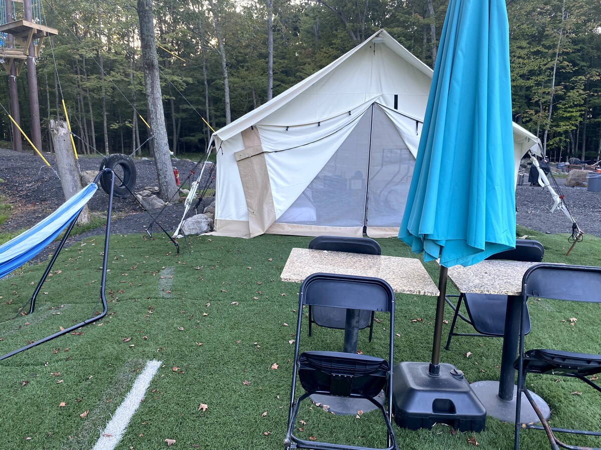Beautiful Glamping tent Experience in the heart of the Hudson Valley! Equipped with electric, mini fridge’s and indoor lighting! Located Tucked into the woods of a Quiet private family campground and Outdoor Activity Park, minutes from Middletown NY a popular hot spot for dining, shopping and entertainment. Short drive from ride from Legoland.