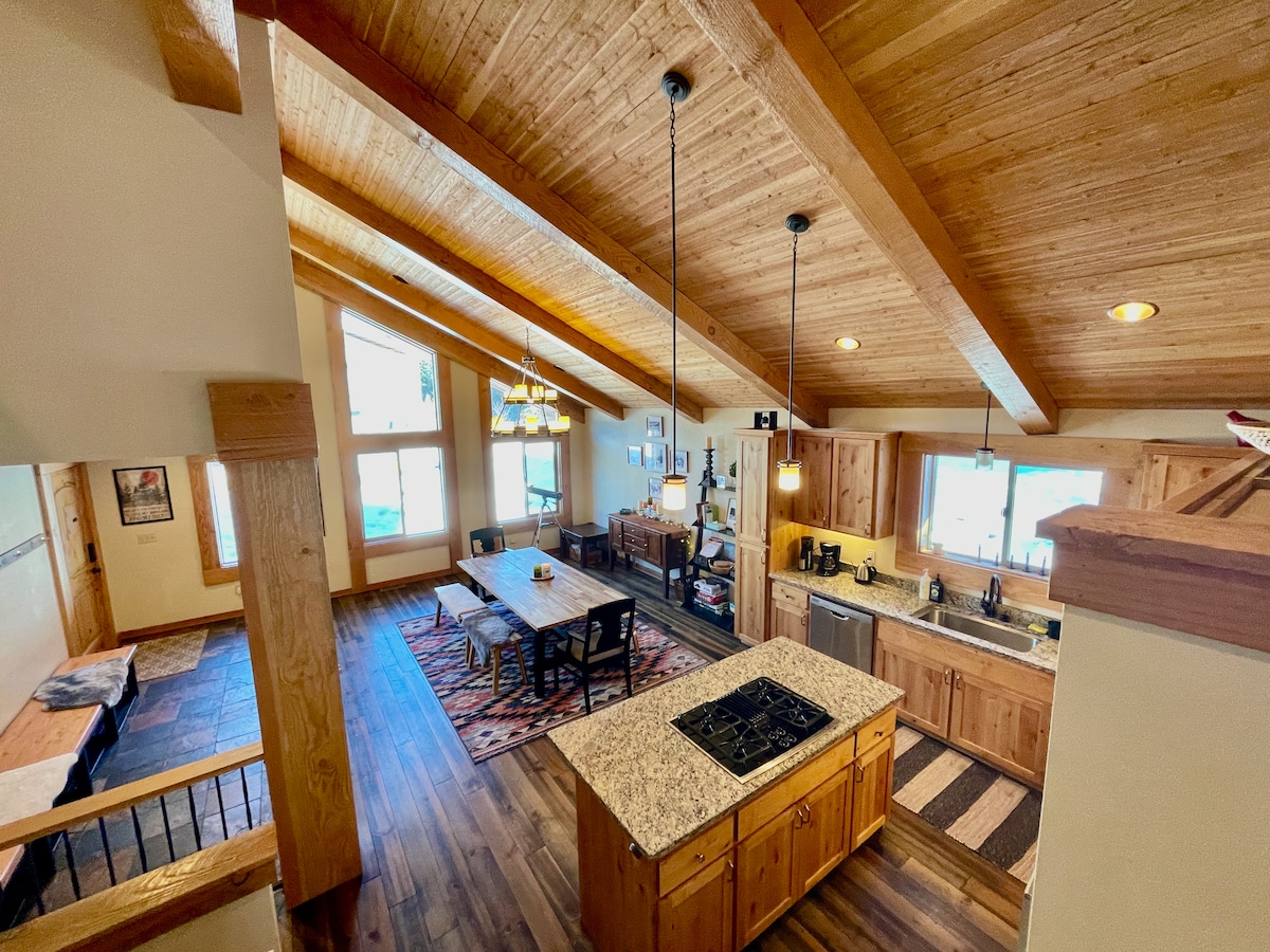 Relax and enjoy crisp mountain air in beautiful wooden seclusion with large cathedral windows, wraparound deck, vaulted Great Room and a cozy woodstove to warm your toes. Step down to the game room and shoot pool, play piano, sip wine and catch a movie on a wraparound leather couch/recliner. Head nearby to ski🎿 , hike, bike🚴, climb🧗♂️ , fish🎣, kayak, and golf⛳️ + free remote yoga🧘 during your stay. Finish your day by soaking those weary legs in a hot tub under the stars ✨ and repeat as needed.