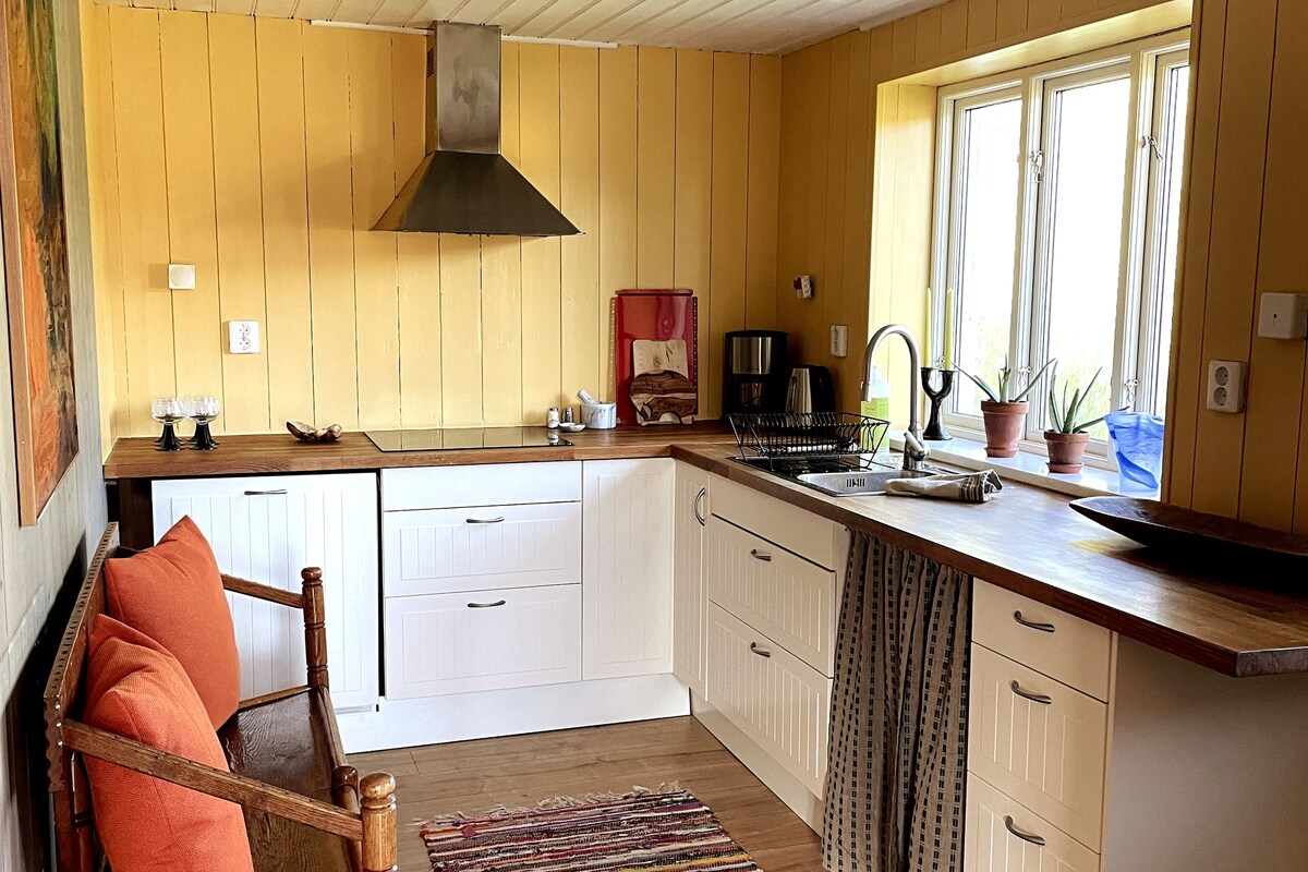 The house and surroundings are especially suitable for families with children, hikers and sport fishermen. Rural, scenic and quiet location. Close to nice fishing spots for sea trout and mackerel. Undisturbed plot with large lawn, climbing trees and rocks. Sandbox, soccer goal and trampoline. Sunny patio with barbecue grill. Fire pit for open fire. Short walk to jetties, small beach and crab fishing. Two hiking trails nearby. Sheep, chickens and rabbits, 2 kayaks and small motorboat for rent. Fast wi-fi. Host family in the neighboring house.