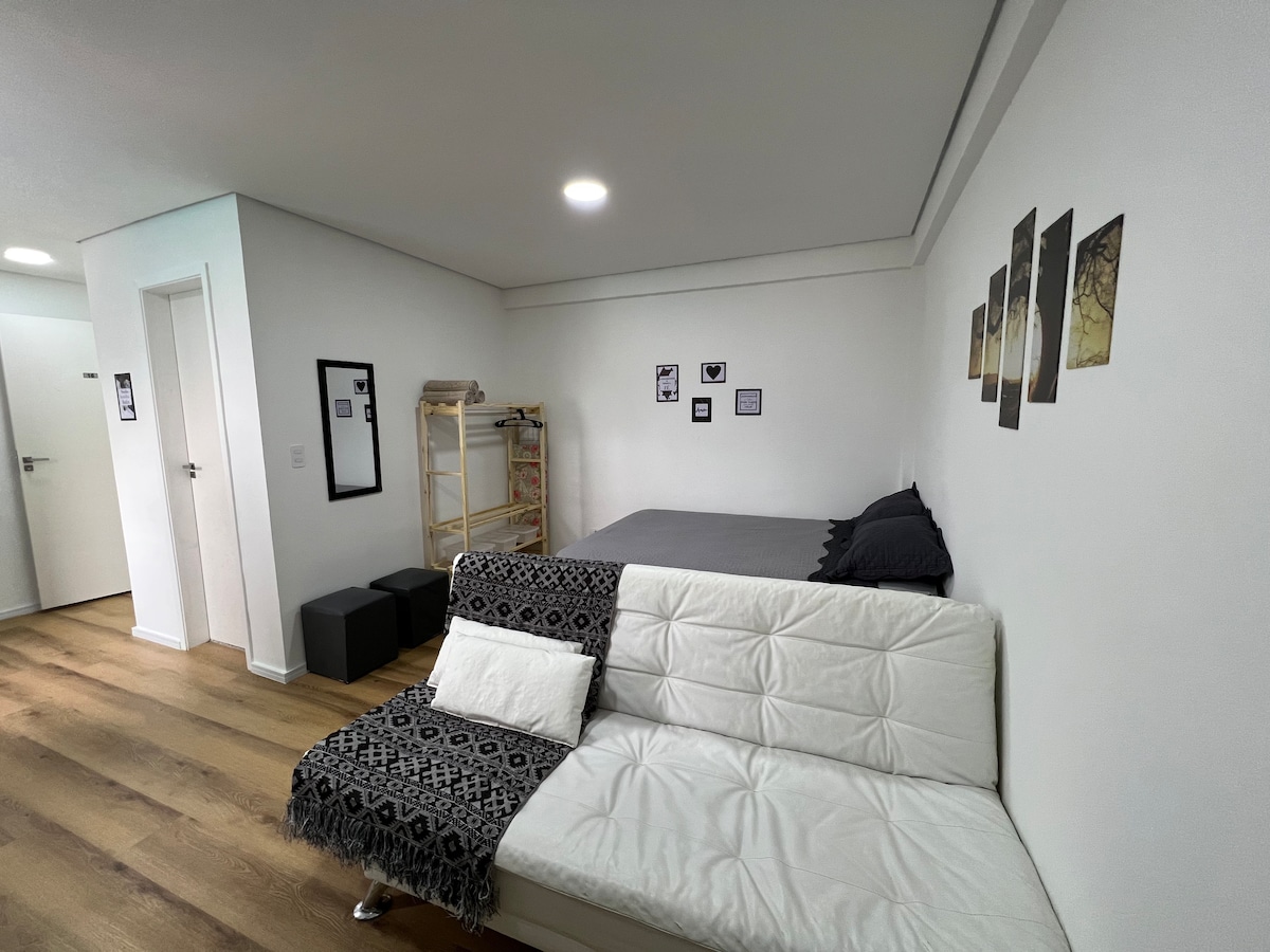Enjoy a welcoming experience in a contemporary accommodation - modern and cozy atmosphere, well located and fully equipped (air conditioning and 65" TV). You will be close to everything (shopping malls, train station a few meters away, easy access to the main highways). The space has fast Wi-Fi, a full kitchen (Airfryer, Nespresso, sandwich maker, microwave, among others) and a super comfortable queen-size bed — everything for a perfect stay.