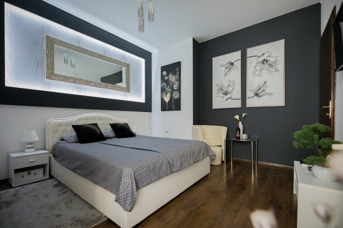 The apartments have entrance halls with large mirrors, open spaces with a dining room, kitchen and living room in one, separate bedrooms and bathrooms with a shower. They are intended for everyone who wants to stay in a spacious, modernly designed space with a touch of retro glamour and all the amenities needed for a comfortable stay. Our apartments are made with the desire to make guests feel relaxed and comfortable and to find peace in them.