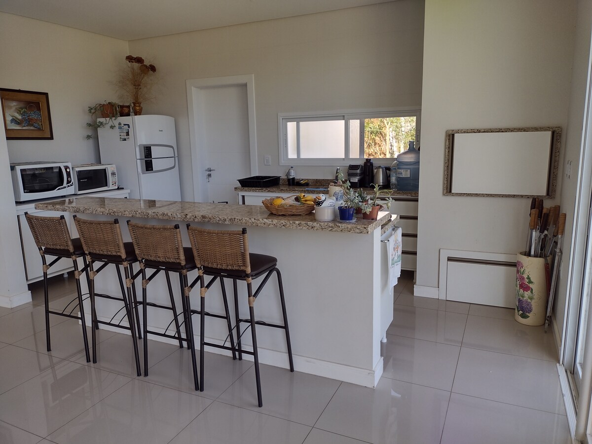 Espaçosa casa em condomínio fechado, em ambiente tranquilo e proximo a natureza. A casa acomoda bem 8 pessoas em 4 suites - todas com ar cond e duas também com vent.A casa possui churrasqueira em conjunto com cozinha americana e lareira. O condomínio possui ampla estrutura de lazer, contando com 3 piscinas, sendo uma termica, academia, salões de festas, quiosques com churrasqueira, quadra de esportes (beach tenis, futebol, bocha), quadra de tenis coberta, playgrounds, acesso a lagoa e mercado.