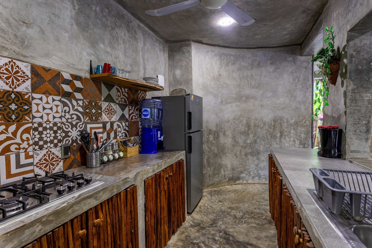 Welcome to VILLA CAYETANA BACALAR Ideal for 2 or 4 people! This place has a strategic location, a 5-minute walk from downtown Bacalar and one block from the lagoon! Nearby restaurants and bars, to explore Bacalar on foot or by bike Complete private house, with all amenities, swimming pool, barbecue, 55” TV, equipped kitchen, Wi-Fi, air conditioning and private parking. The house has 2 bedrooms (one of them underground, bunker type) and a full bathroom.