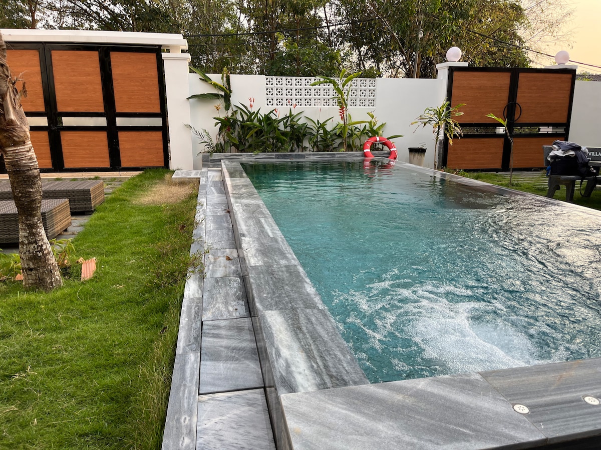 We offer 3-bedrooms villa with separate living room, dinning table, and large kitchen. Our guests will enjoy the free access to large pool 110 square meters, shallow water for kids, and deep water for adults to dive in. There's free use of playground, outdoor bbq table and facility. There's a free large, safe parking on the premise. our place is surrounded by big tree, garden, fruit trees and variety of birds. We also serve food and drinks starting from 7 am to 9pm.