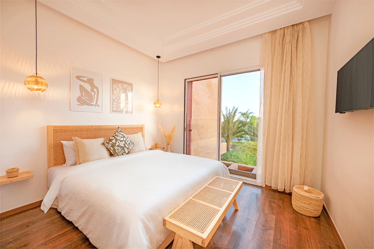 Bienvenue à Palm Nest, un appartement lumineux et paisible niché au cœur de la Palmeraie, à seulement 8 km de la Médina. Vous profiterez d’un cadre calme, entouré de palmiers et d’oliviers, avec 3 terrasses privées, dont deux offrant une belle vue sur le lac et les jardins. Entre un réveil en douceur sur vos terrasses, des moments de détente dans la résidence et des promenades dans les jardins, tout est pensé pour votre bien-être et votre confort, sans artifice.
