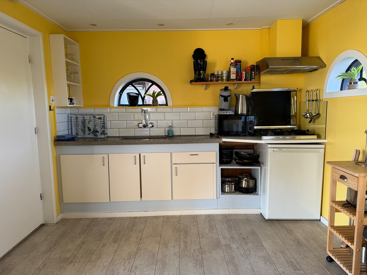Cozy cottage in the garden. Scandinavian furnished with kitchen, bathroom, dining area and enough space to play for the children. Upstairs, two bedrooms under a sloping roof, equipped with their own sink and mirror, and a sweet little room with a dresser and crib. In the basement, there is a bar, foosball table and sofa with television. Outside a spacious garden with playhouse and trampoline. NEW wood-fired hot tub in the garden. NOTE: wood is available for 1x hot tub heating. NESPRESSO COFFEE