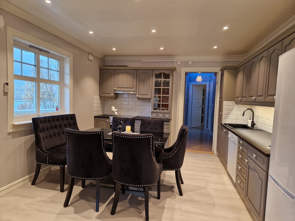 Spectacular new build house (2018) in a lovely, quiet area with a beautiful view to the fjord/sea, mountains and forest in Kvaløya /Tromsø. You can watch the beautiful northern light / aurora borealis from the huge window (10 sqm), sitting in the living room with a cup of tea or coffee in your hand:-) This is a perfect place for tourists who wants to see the northern light, whales in the fjord at winter, hiking/ skiing in the mountains or everything else you want in this lovely city.