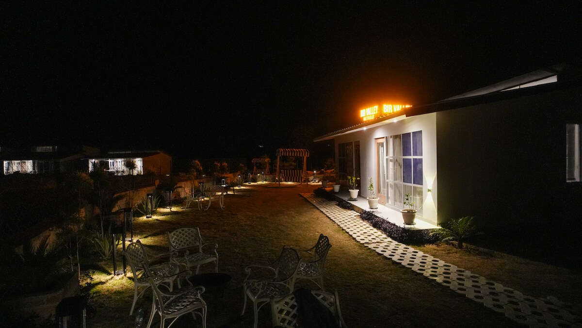Urban cottages in Bir Valley- offering contemporary living across from the landing site with panoramic views and equipped kitchen. Enjoy Bir Valley's stunning scenery in our fenced/ secure property, perfect for solo travellers, couples and families. Steps from the paragliding site, our cottages offer convenient access to local cafes, and shops within a 2-3 minute walk. Savor a sunset BBQ and bonfire while watching paragliders in our garden after a long day exploring.