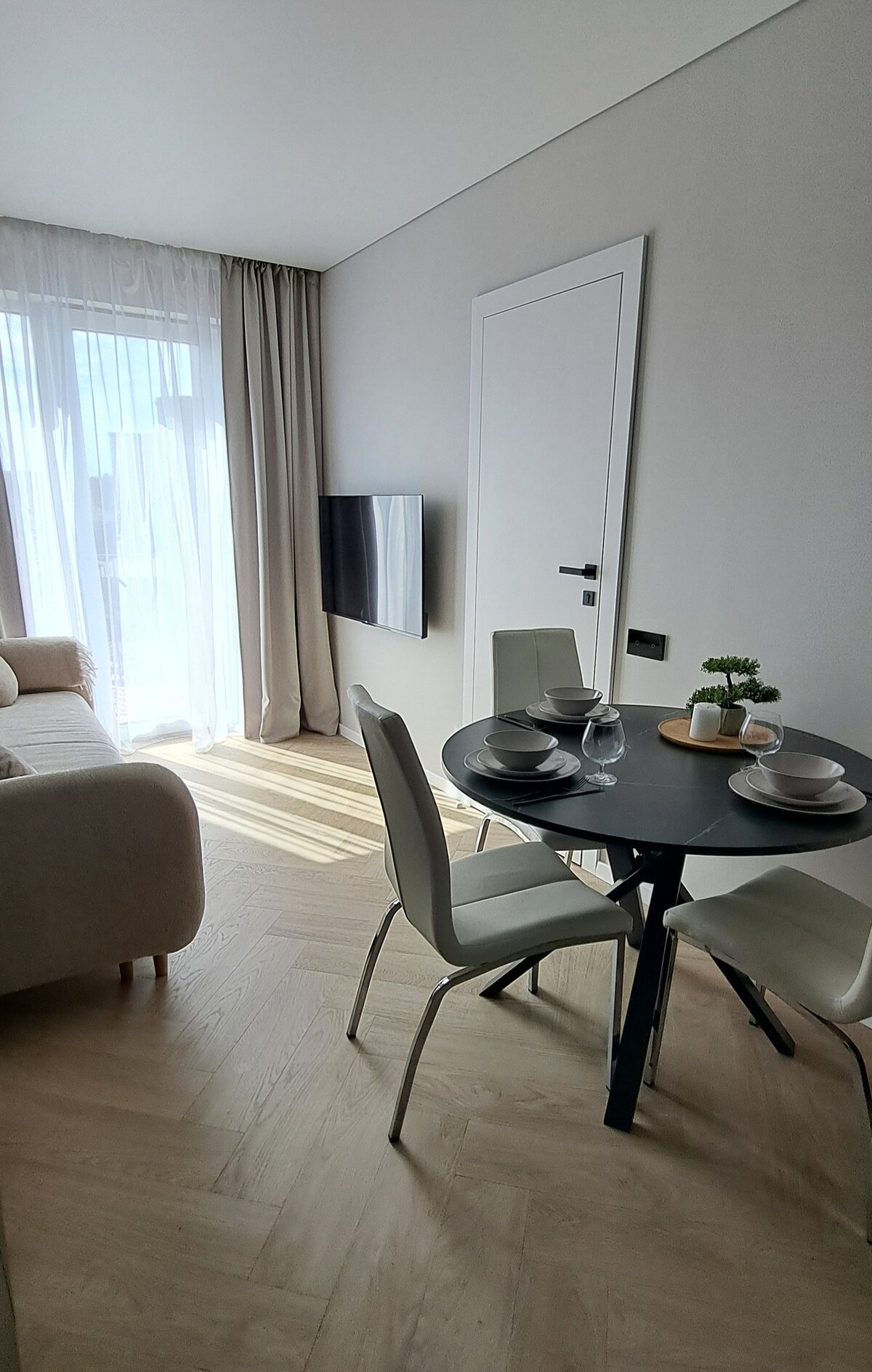 Stylish 2BR Seaside Apartment with Panoramic Views Modern 2-bedroom, 2-bathroom apartment in the Elija complex, featuring stunning sea views. Just minutes from the beach and pine forest. • Panoramic windows with sea views • Fully equipped kitchen • Master bedroom + sofa bed • 2 workspaces with high-speed internet • 12km from Palanga center • Near scenic Ošupis trail Perfect for beach lovers and remote workers alike!