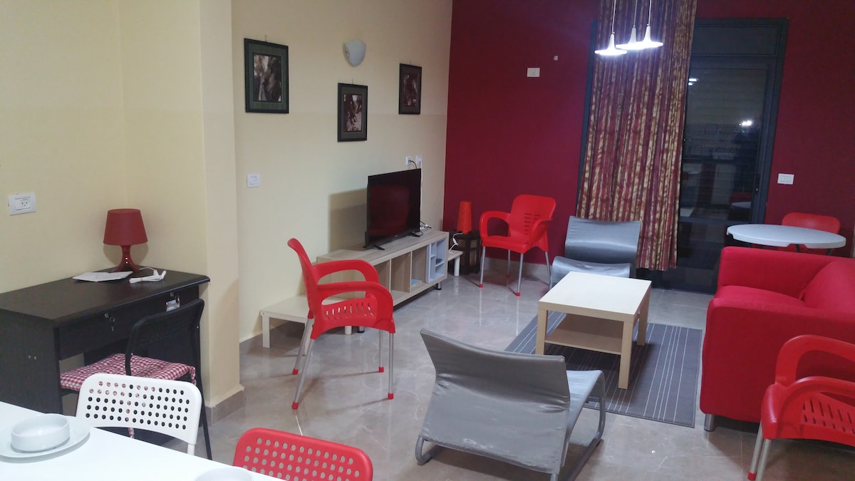 The 3 rooms apartment is on the top of a 5 floors building with external terrace . In Zababdeh town five thousand inhabitants where lives 70% Christians, Catholics , Greek Orthodox and Protestant and 30% Muslims . It lays on a hill 350 m above the sea level . Three kilometers from the Arab American University 13 kilometers from Jenin City . Private clinic. The roof apartment has a fantastic views, with external smoking area.