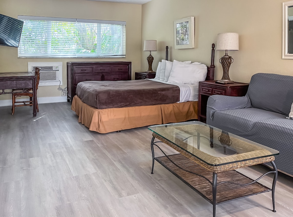 Premium King w/ Private Patio in the Heart of Boca Raton 🌴✨ Our spacious 375 sq ft Premium King Room: Perfect for business travelers, couples, or quick getaways. Enjoy a plush king bed, a comfy sofa bed, a kitchenette, private bathroom, smart TV, and a dining/work table that does double duty. Step outside onto your private Patio with cozy outdoor seating - the ideal spot for your morning coffee or sunset vibes. This trendy spot puts you in the heart of everything Boca Raton has to offer.