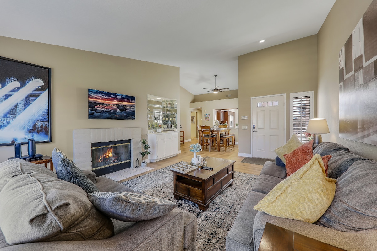 Desert escape in a private community with mountain views, resort amenities & fast 1G Wi-Fi. ★ "Beautiful, conveniently located, and exactly as nice as it looked online." ☞ Patio w/ BBQ + outdoor dining ☞ Resort access: tennis, gym, golf course, pool, pickleball ☞ Multiple smart TVs (living + bedrooms) ☞ Fully equipped kitchen ☞ Garage and driveway (4 cars) ☞ 1GB Wi-Fi + workspace ☞ Onsite washer/dryer ☞ AC + heating 》10 mins → DT Palm Desert (cafés, shopping, dining) 》20 mins → Coachella