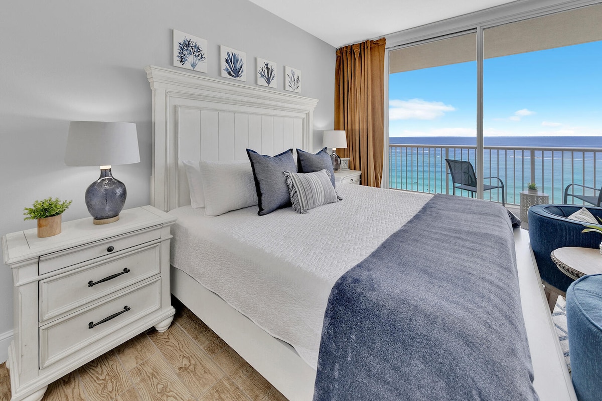 Follow the sun to this beautifully renovated oceanfront studio—where white sand, warm breezes, and crystal blue waters await. • Free beach chairs and umbrella included with your stay (March 15 – October 31). • Relax on your private balcony overlooking one of the most breathtaking beaches in the world. • Centrally located – park your car and forget about it! Walk to top-rated restaurants, Pier Park, and many local favorites.