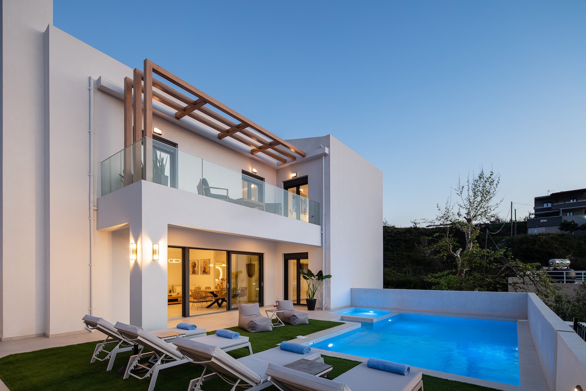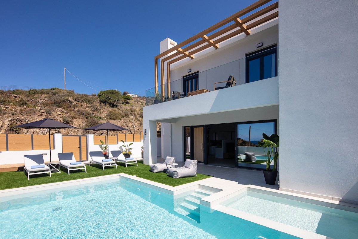 Located in the heart of the seaside village of Panormo, this private villa enjoys a truly rare setting with the beach just steps away, along with excellent restaurants, cafés, and local shops. Designed to host up to 10 guests, the villa features four elegant bedrooms, iconic interiors, generous outdoor terraces, and two private pools, including a heated pool with hydromassage jets and a counter-current swimming system.