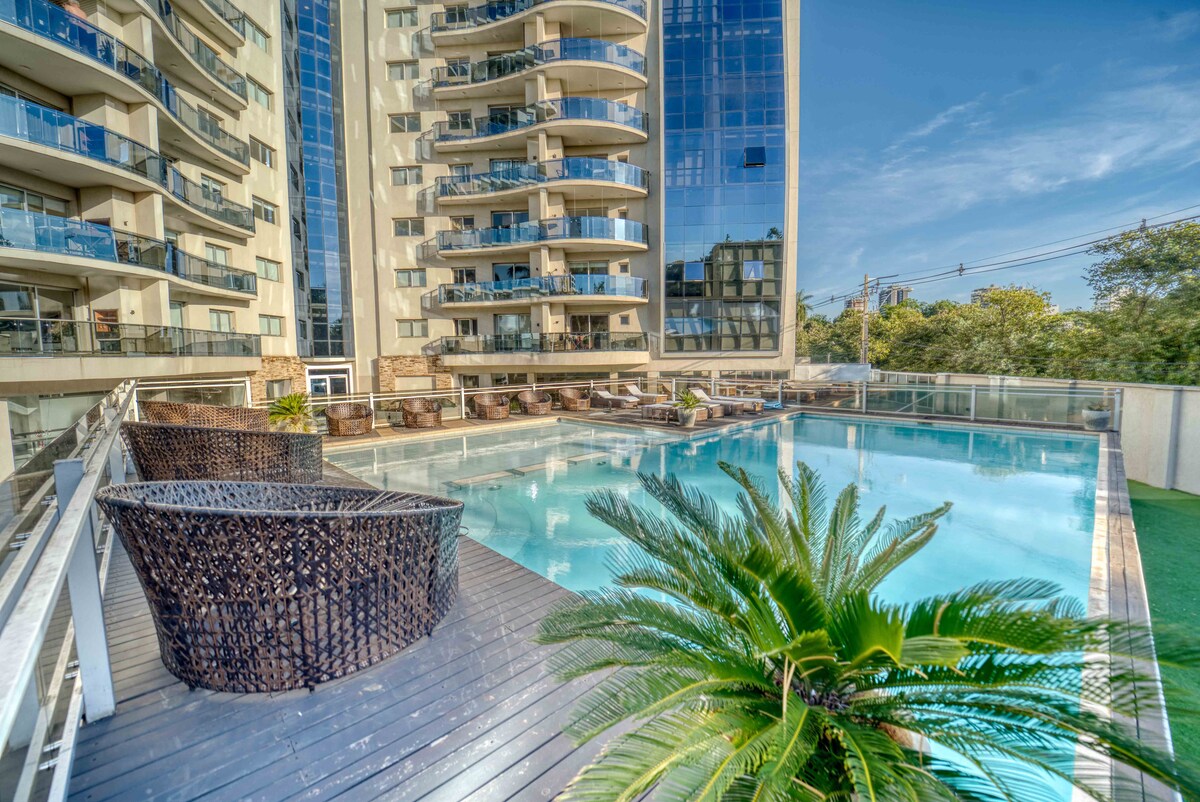 Departamento premium súper equipado. Cama king size, lavarropas, balcón panorámico con parrilla, WiFi, Smart TVs y Escritorio con monitor 27" y UPS. Amenities de categoría: - Piscina + solarium - Piscina climatizada - Sauna - Gym + Rooftop - Quincho - Laundry - Seguridad 24hs - Garage Excelente ubicación en zona residencial muy segura: - A 7 minutos del Eje Corporativo, Shopping del Sol y Paseo La Galería - A 10 minutos de la Costanera y el Puente Héroes del Chaco - A 15 minutos del Aeropuerto