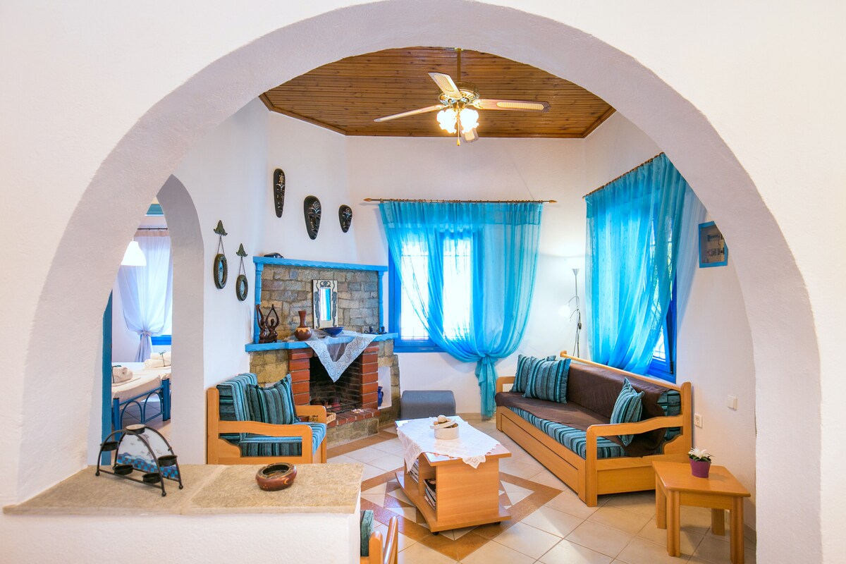 Since 2017, we've hosted more than 110 groups of guests, providing excellent accommodation in a relaxed, beautiful, quiet and friendly environment. It's a traditional island villa built by our family with love, respecting the island's identity, nature and architecture. The villa is spacious and ideal for 6 guests. It has a large yard with a built-in grill, a furnace and a shower spot next to the garden sitting/dinning area. Trust us for your vacation and make great summer memories!