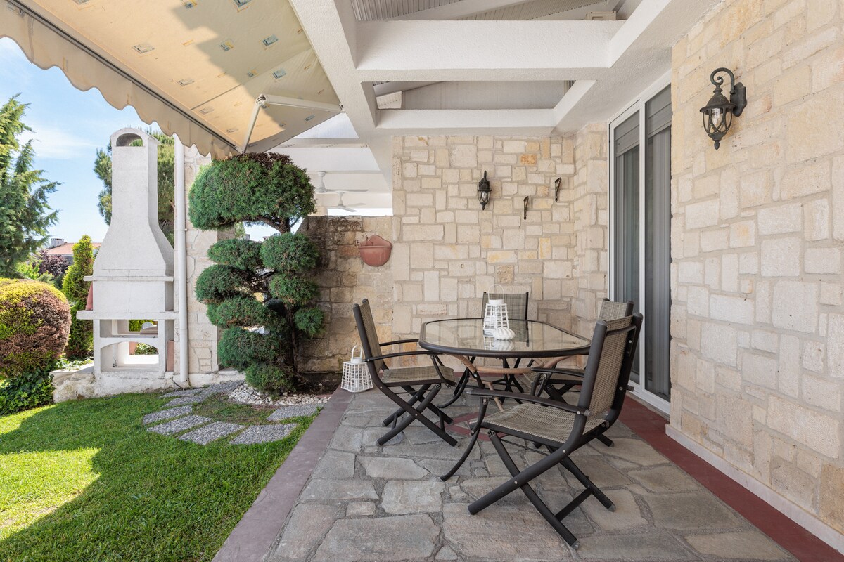 Villa into Sani's pine woods forest. 20' on foot from Koutsoupia beach, Sani beach, Sani Resort and Marina. Garden and balcony in addition to the unique scenery to spend quality time with your loved ones. Private parking spots: 2 The unique position of our villa ensures that you get both the relaxation you seek but also you can have all the amenities that Sani Beach Provide.