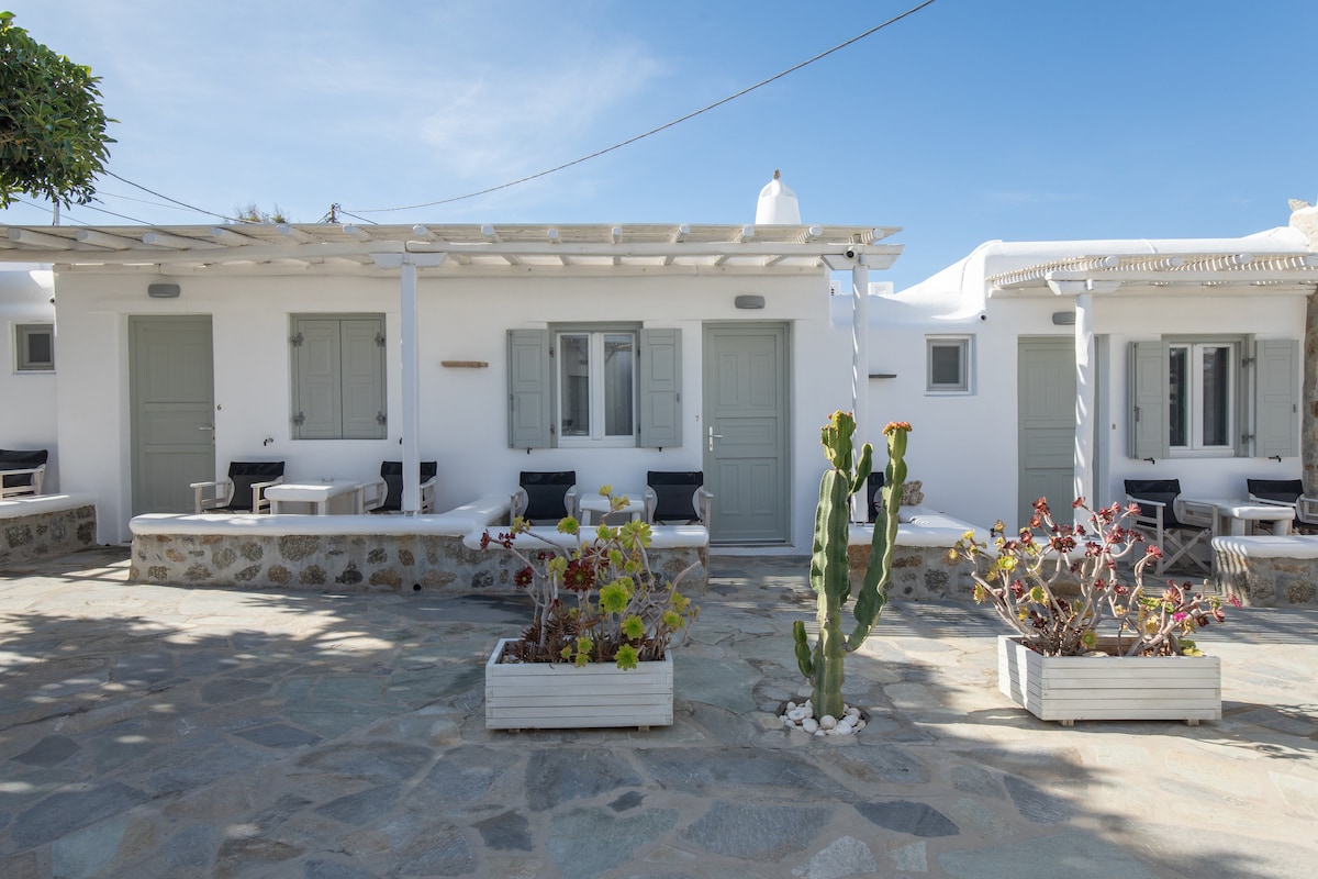A new-renovated nice and quiet studio of 20m2, with sea view. The place is just 1,5 km away from Paranga Beach & Scorpios, and 4,5 km from Mykonos village. Big terrace with pergola. Small outdoor kitchenette and outdoor dinning area where you can have great dinner, or a glass of wine on the cosy built-in sofa under the stars of Mykonos. The place is oriented south, so the northern winds of Mykonos don’t disturb at all !