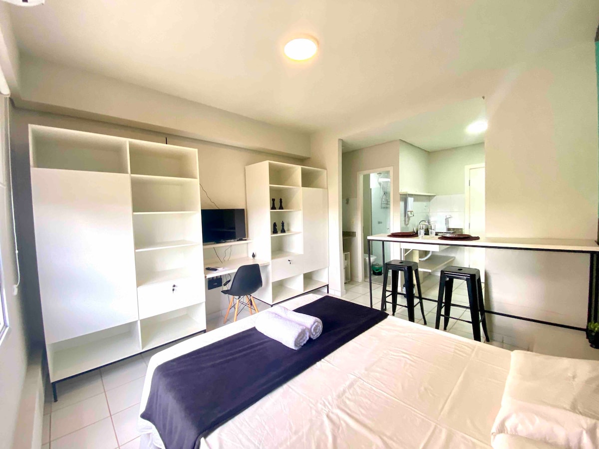 Take it easy at this unique and tranquil getaway. Complete studio with Wi-Fi, smart TV, AC, Alexa, kitchen utensils, coffee maker, water filter, hairdryer, iron and everything else for your comfort. You can choose between 2 single beds or 1 queen bed. Enjoy common areas such as a swimming pool, elevator, parking, laundry, 24-hour concierge, study or meeting room, and gourmet space. Excellent location, close to São Francisco Hospital and UNAERP College.