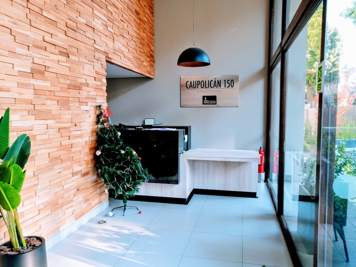 Beautiful two-room apartment, in the heart of Concepción, quiet environment with all the comforts for a great stay. Free parking. Located in the city center near the main attractions (Mall del Centro, Universities, Shopping Centers, Parks). Excellent connectivity and transportation option to the door. It has a crib for a better stay for parents. It has a futon-bed (for third guest - additional cost)