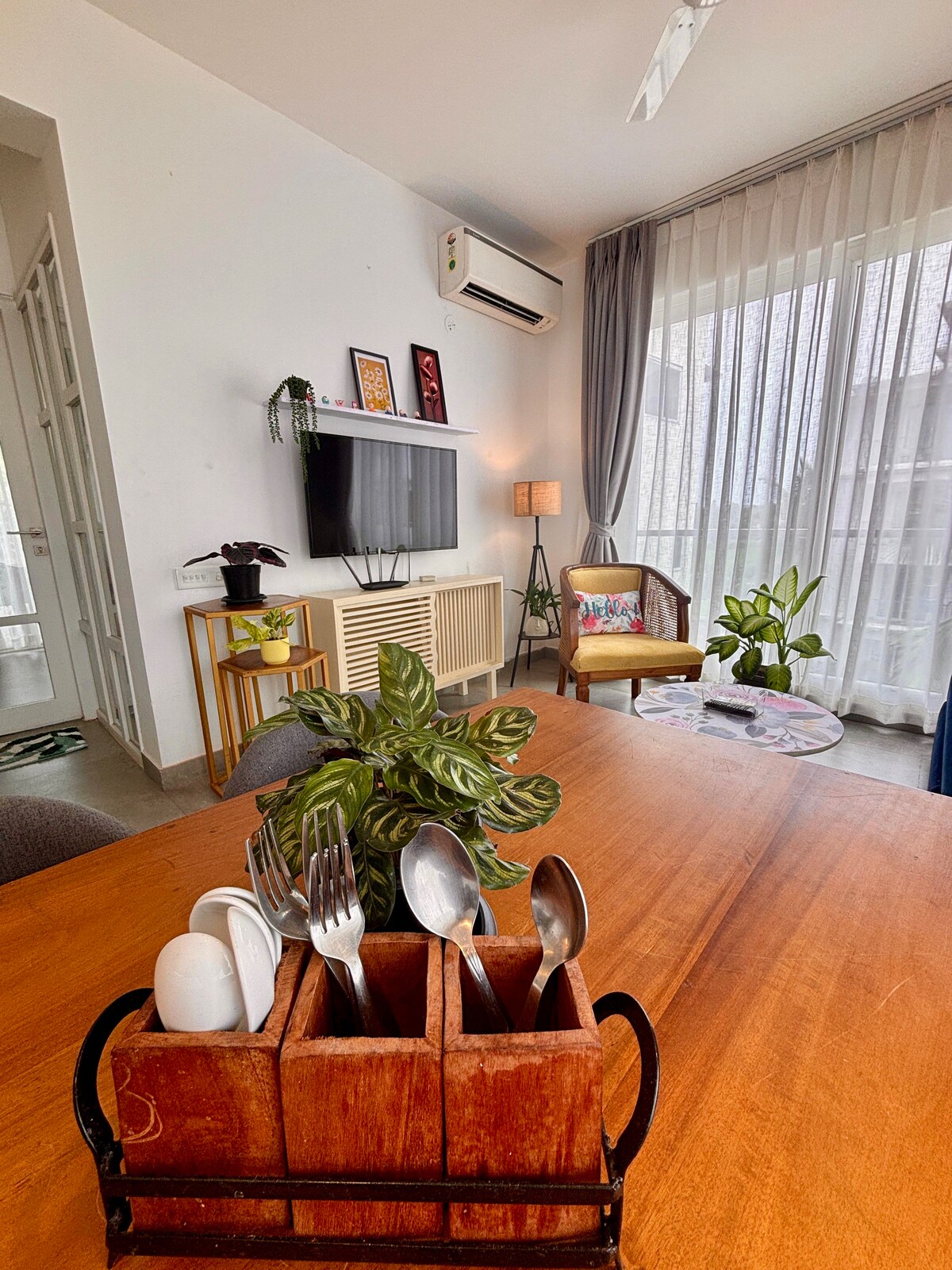 ☆ Private pool right in your balcony ☆ Located next to all major beaches in North Goa ☆ Calangute Beach 6 Mins 🛵 ☆ Candolim Beach 13 Mins ☆ Vagator Beach 25 Mins ☆ Anjuna Beach 25 Mins ⇒ Easily Access both Airports ⇒ Peaceful Neighbourhood ⇒ Perfect for WFH. Includes a Desk & Fiber WIFI ⇒ Ample parking space for both cars and bikes ⇒ Sleeps 4 Adults ⇒ High-end furnishing, French silverware, 1 king size bed and 1 queen size sofa bed ⇒ 55” Smart TV, PlayStation and Marshall Speakers
