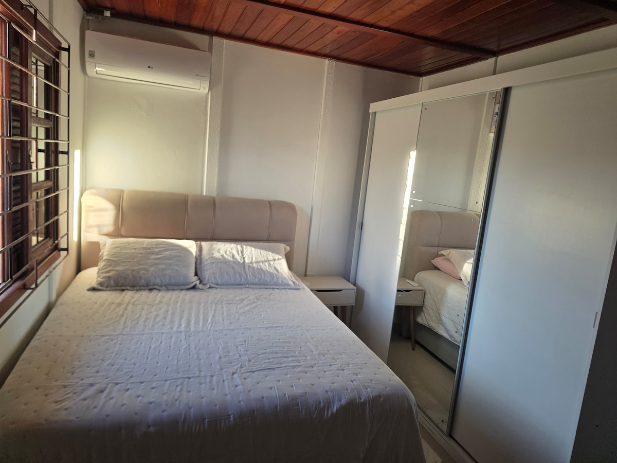 1 bedroom with air conditioning, large covered and closed garage, washing machine, barbecue, fireplace, wi-fi and workstation. Capacity for up to 4 people, located on Rua Araranguá, on the corner of Beira Mar, facing the beach, 450 meters from the Mampituba river that borders Torres. In the bedroom a double bed, in the living room an overhead bed and a sofa bed that can be transformed into two single beds or another double bed. We have trousseau for rent or you can bring your own.