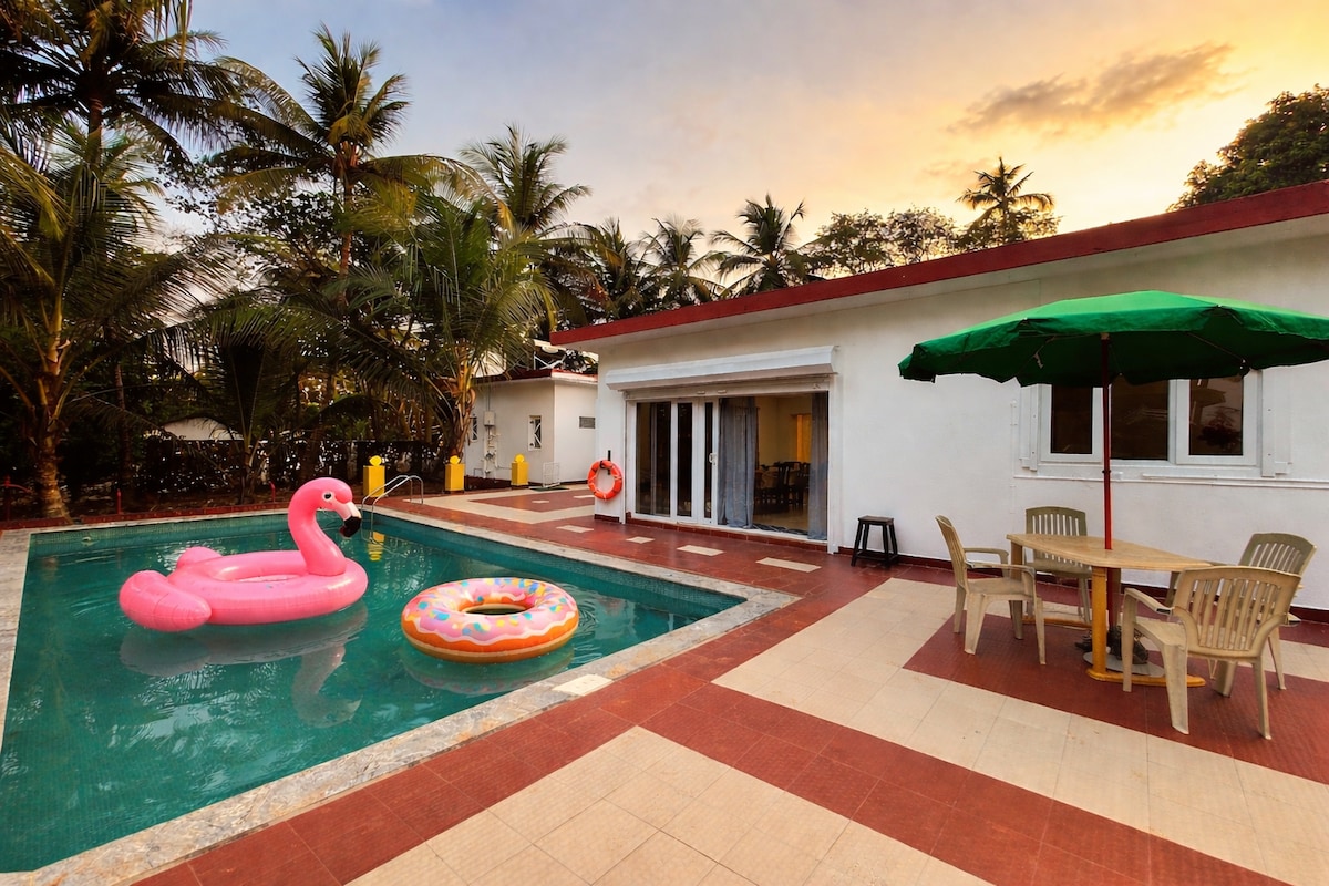 Nestled in tranquil Quepem village, this 3 BHK fully furnished pool villa sleeps up to 10 guests amid flourishing mango and fruit trees. A sprawling living room with 65″ smart TV and full-property Wi‑Fi opens to your private pool and outdoor BBQ. The fkitchen boasts a microwave, range, fridges and full cookware. Only 5–7 min by car to the vibrant Quepem market. Perfect for family get togethers to escape the busy city life or a group of working professionals who want to enjoy a perfect worcation.