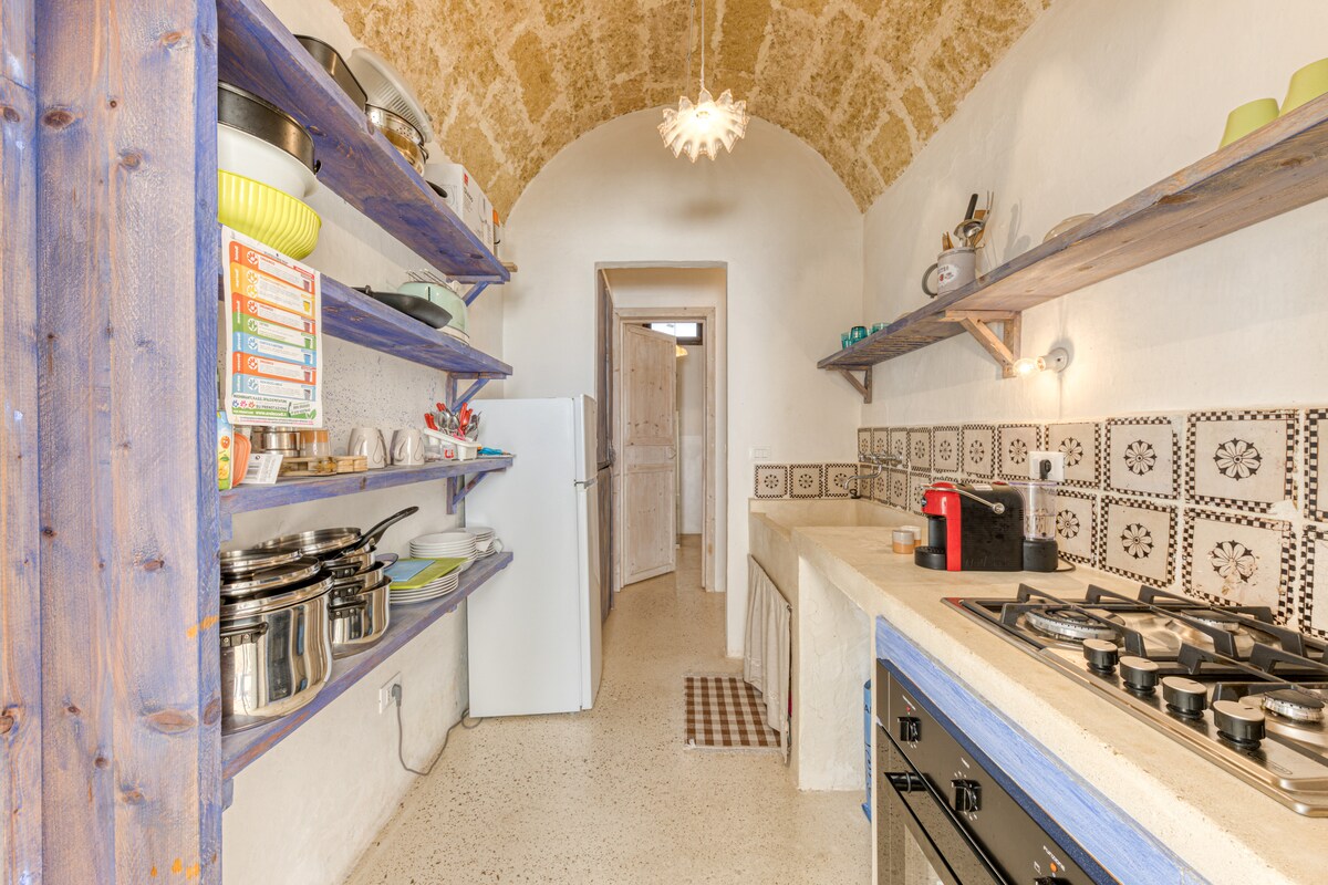 In the small village of Patù, in an ancient courtyard, the Casetta Salentina was born. Located in the historic center of the small town, 50 m from the main monuments, such as the Church of San Giovanni Battista, the Centopietre, elected as a national monument, and the Fortino, symbol of the ancient walls of Patù, the house is a witness to a past rich in history and traditions. Recently renovated, it still retains the ancient cement floor, and the typical Star and Barrel vaults, 3 km from the sea.