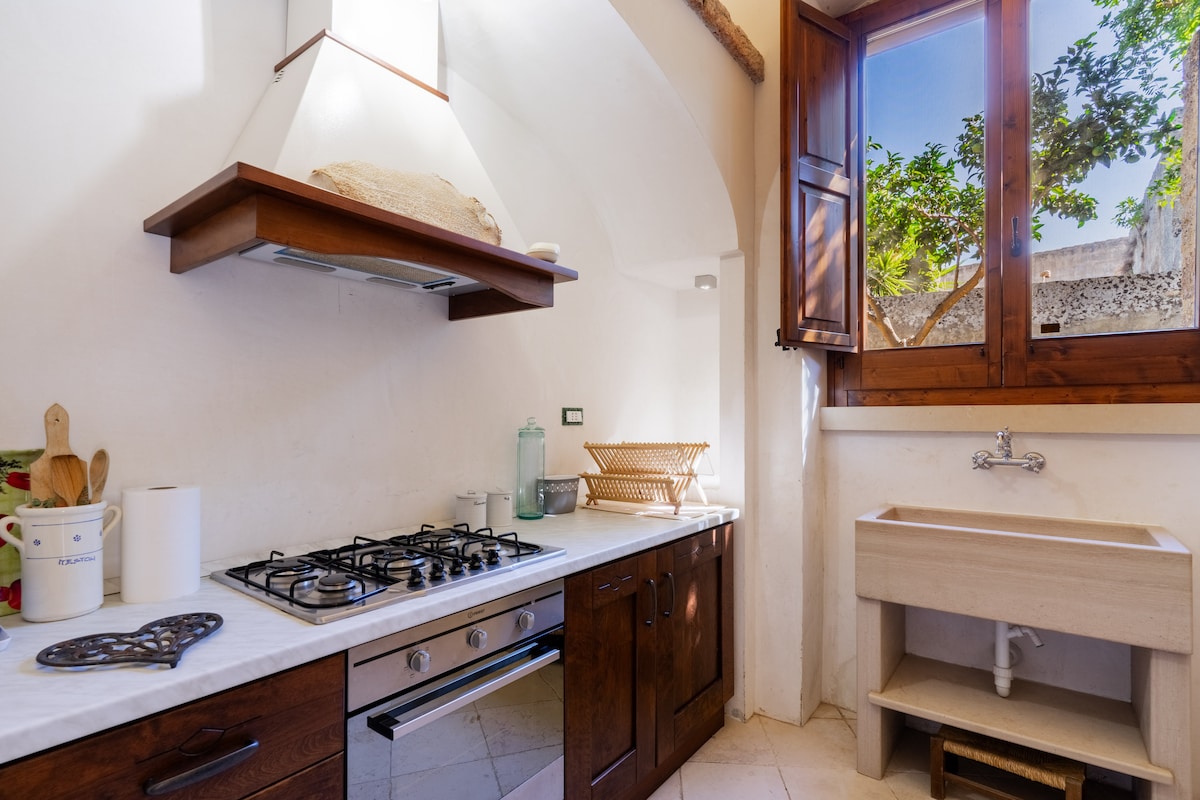 A recently renovated property, characterized by furnishing accessories that recall the tradition of Salento and equipped with a large Mediterranean-style garden with enchanting 180º view of the Ionian Sea. In the garden there are plants and fruit trees and others such as fig, rosemary, myrtle, prickly pear, wild fennel and many other species. The trullo is ideal for a vacation full of nature and tranquility.