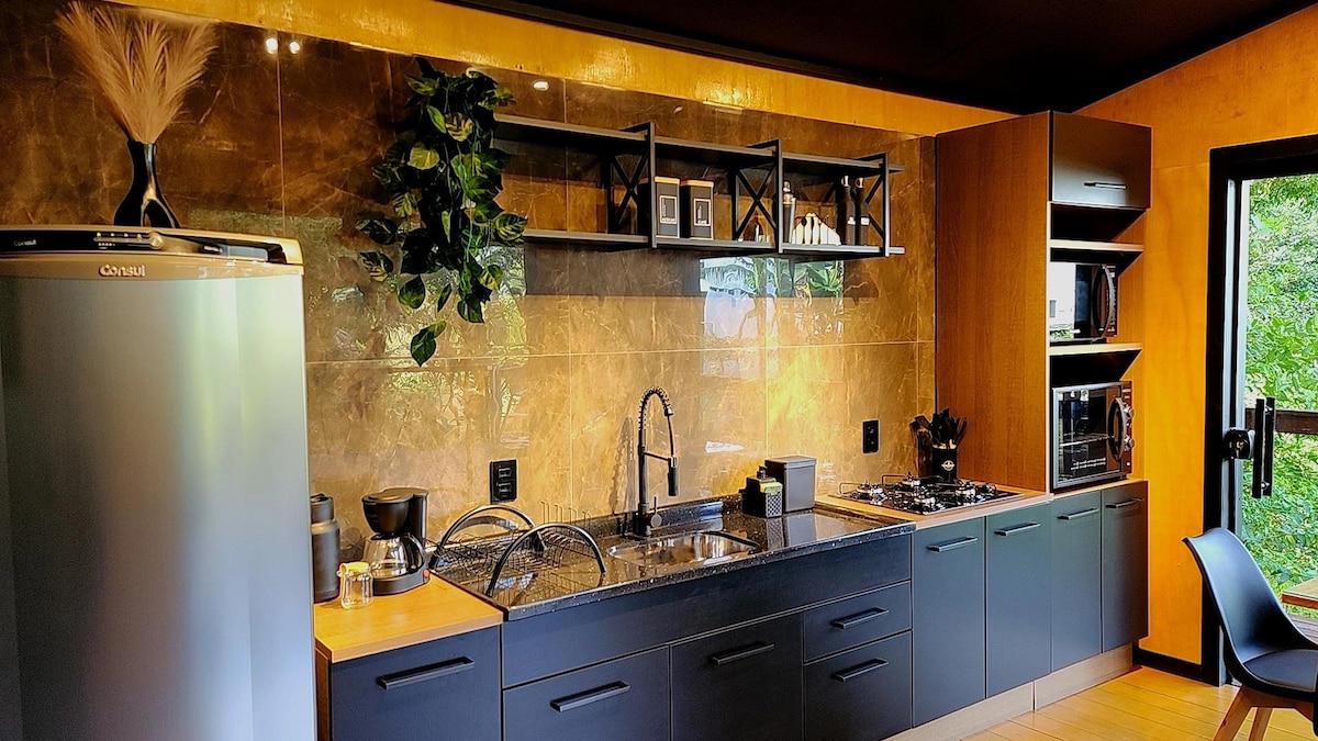Welcome to our charming Gran Chalé, a fusion of Canadian mountain style, but close to stunning beaches such as Garopaba and Rosa. We offer a unique and relaxing experience in the heart of nature, with a whirlpool on the mezzanine and a stylish bathroom with two showers for couples. Surrounded by a stream, the cabin provides peace in the heart of the woods. The full kitchen and living room with a sofa that turns into a double bed ensure comfort. Enjoy peace and harmony in this authentic retreat.