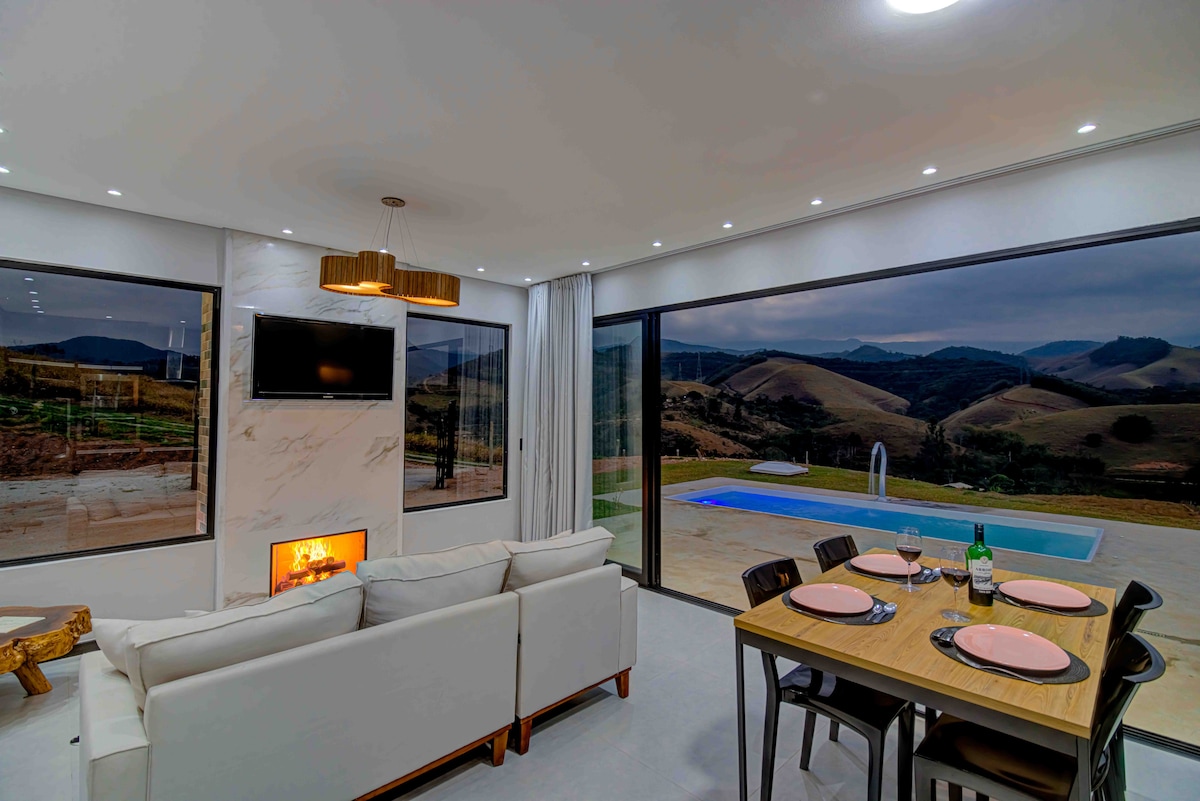 Located on one of the highest mountains in São Bento do Sapucaí, Chalet nas Nuvens (just 20 minutes from downtown São Bento) is a luxurious glass mountain house offering exclusive trails, a farm with animals, hot tub, thousands of fruit trees, a bbq, deck with the most beautiful sunset in the region, a fireplace, fire pits, and magnificent year-round views of the Serra da Mantiqueira Mountains. We like to call it "heaven on earth."