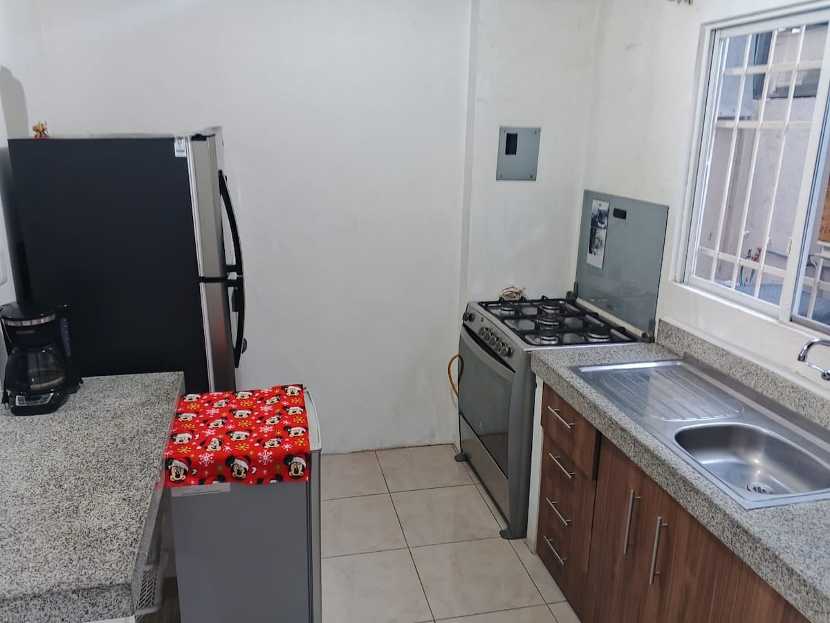 Cozy and spacious house. Where you can breathe a quiet atmosphere. If you come with family, it is ideal as it has a large backyard where children can run and play. 3 spacious rooms, one of which has its own bathroom, very bright and with ventilation. Fully enclosed, completely private from the neighbors' view. Fully furnished. Ideal for families of 4 or 5 members. We even have 2 extra beds if you are a group.