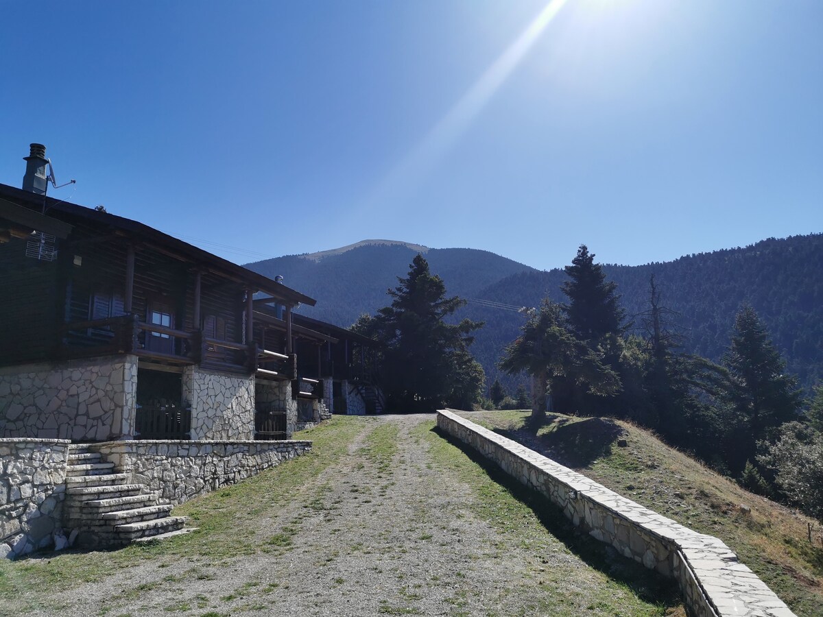 Wooden two-storey chalet literally in the forest at an altitude of 1300 meters. Just 15 minutes from the center of Kalavrita and 15 minutes from the Ski Center, with incredible mountain views The main area has 2 bedrooms, kitchen, dining room and living room with fireplace as well as 2 bathrooms. The guest house with a separate entrance has its own kitchen and bathroom, and accommodates 2-3 extra people in an open space. *The Guest House is only available for reservations of 5 people or more.