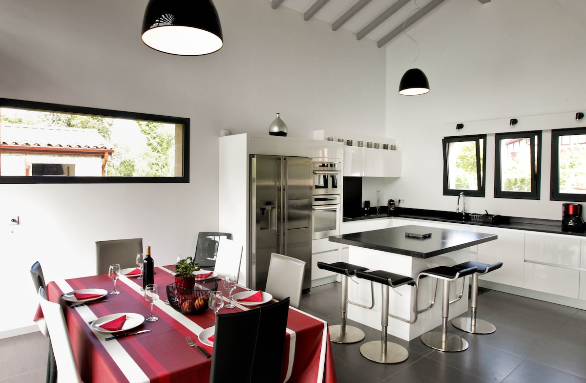 Maison jumelée d'architecte lumineuse nichée au cœur du Pays Basque. Une décoration soignée, de grandes baies vitrées qui donne sur une terrasse en bois de 38m² et une piscine chauffée privée. Les plages à pied en moins de 15 minutes.