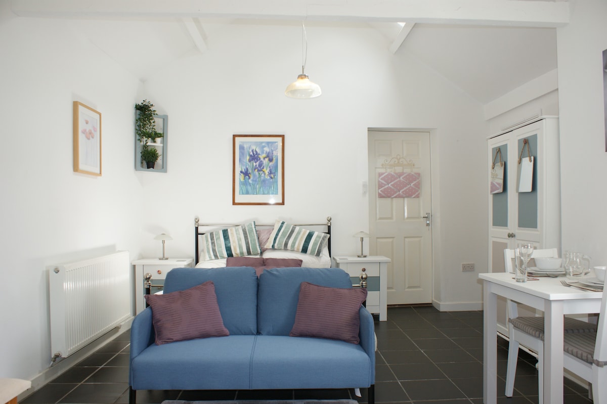 This expertly refurbished 19th-century Coach House is full of character and all ready for your luxurious relaxing break. The open-plan living area has a exceptional view, and when you want a change there's a large smart TV and good-quality broadband for entertainment. The kitchen comes with induction hob and oven, dishwasher and washing machine, as well as all the pots, pans & utensils you need for cooking up delicious meals. The shower room/toilet is conveniently tucked away in a corner. Walk up the distinctive oak staircase to find the upstairs bedroom, with its impressive round window. It sleeps up to three people in a kingsize double bed and a separate single, and there's also room for a travel cot for an infant.The Coach House is ideal for a couple on a romantic escape, or for a family with young children looking for a safe space to relax and play. KEY FEATURES - One bedroom – upstairs, with kingsize double and single bed, space for travel cot. - One shower room/toilet – downstairs. - Sleeps up to three, and infant. - Private outside terrace area with view, shared use of 1.5 acre secure meadow & gardens. - Dogs welcome, two maximum, small additional charge. - Young children welcome (but you may need to bring a stairgate for safety). - Smart TV (Netflix, iPlayer, Freesat etc). - Good-quality broadband/Wi-Fi (free). - Induction hob, oven, microwave, fridge (freezer available if required), dishwasher. - Dining table for four, two leather sofas. - Washing machine (and use of dryer if required). - Underfloor heating (powered by eco-friendly air source heat pumps). - Wood burner, first basket of logs free. The Coach House is bookable by the week (start day Friday), and for weekend and mid-week short breaks.