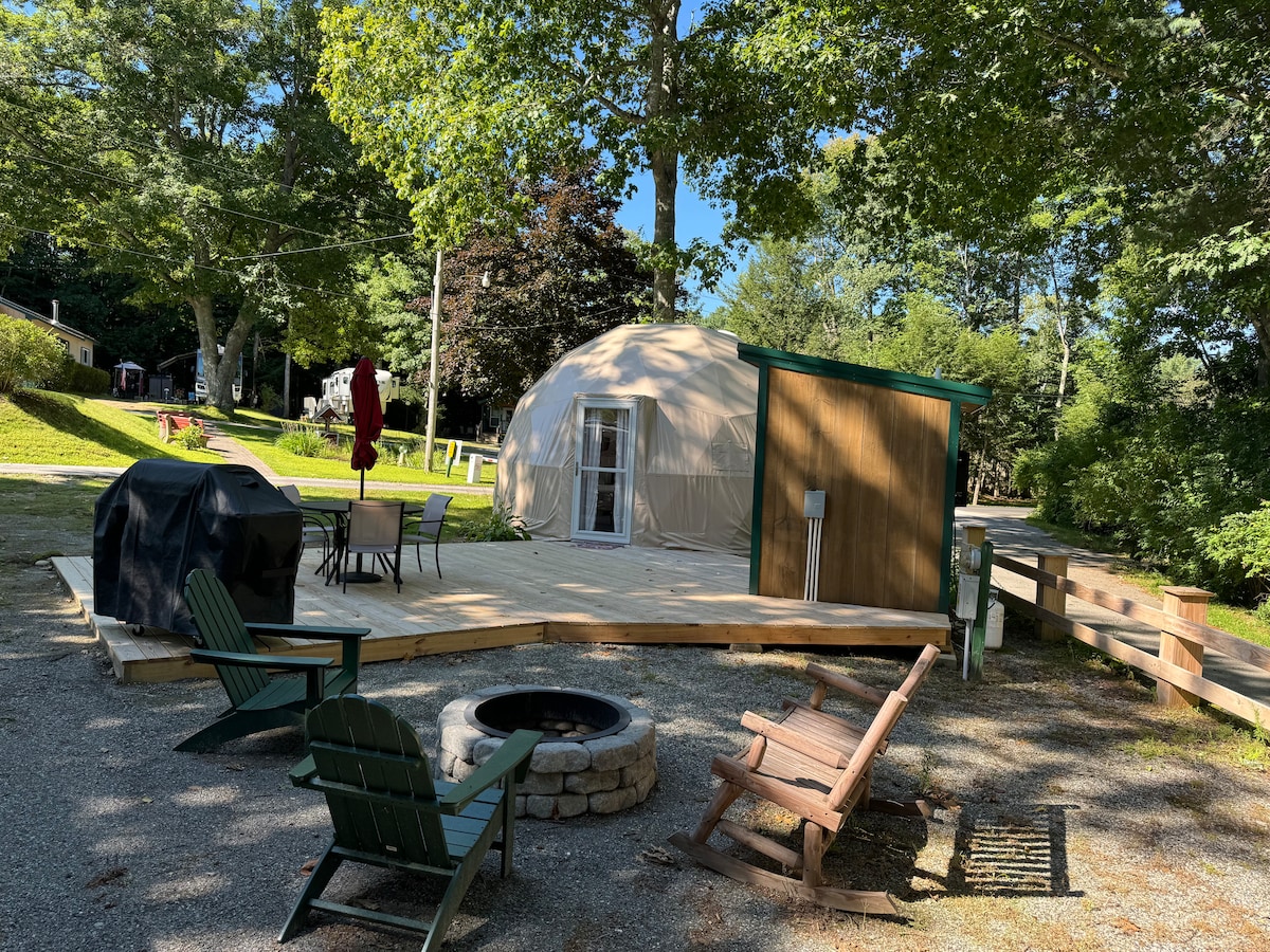 Our Geo Dome offers a deluxe experience, featuring a large window at the entrance and a spacious deck that connects the dome to a private bathhouse. Inside, you will find a kitchen area, sink with running hot/cold water, a mini fridge, a microwave, and a coffee maker. The sleeping arrangements include a queen-sized bed and a futon, accommodating up to three guests. We provide all linens and towels for your convenience. Outside, you’ll discover a table and chairs, as well as a fire pit and grill.