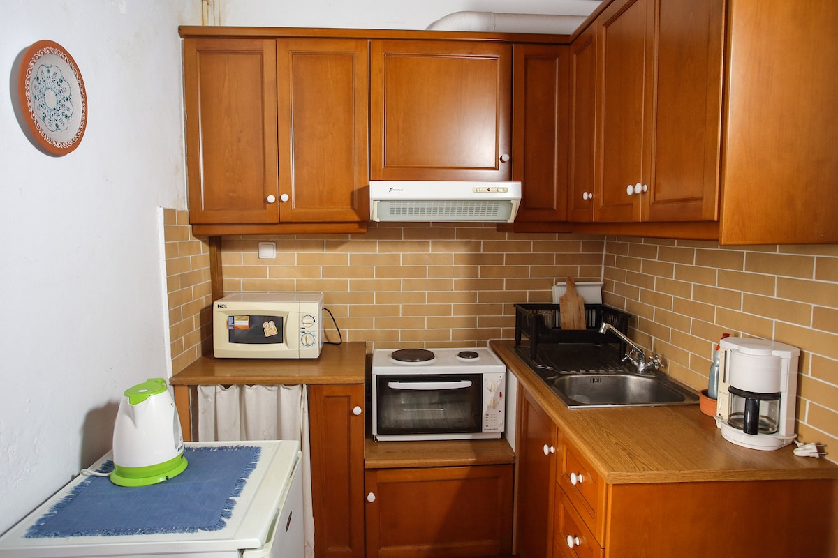 A warm, friendly, modern, ground floor space of 35sqm, fully equipped and furnished. It has 1 double bed, TV, refrigerator, kitchen, hot water 24 hours a day, air-condition, WIFI, and a small terrace at the entrance. It is located in a quiet neighborhood in Nea Alikarnassos and very close to the airport (1.6km), the port (2.5km), the city center (2.7km), the beach (5.2km) and a junction for access to the national road (1km).
