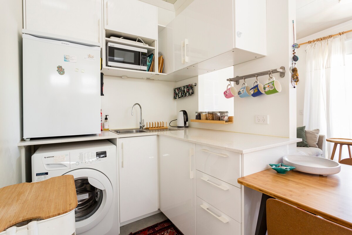 Small studio beach-side cottage with everything you need. Has a queen bed and a folding single bed, A/C, TV, fully equipped kitchenette with fridge/freezer and Nespresso mashine. Includes your own laundry with small washing machine, toilet and shower; and your own little patio with wind-out awning. Only 2 minutes walk to beach and 12 minutes walk along the beach to Cafe and Restaurant strip. There is a nice 5 km walking path along the beach with lots of playgrounds, BBQ's and picnic pavilions.